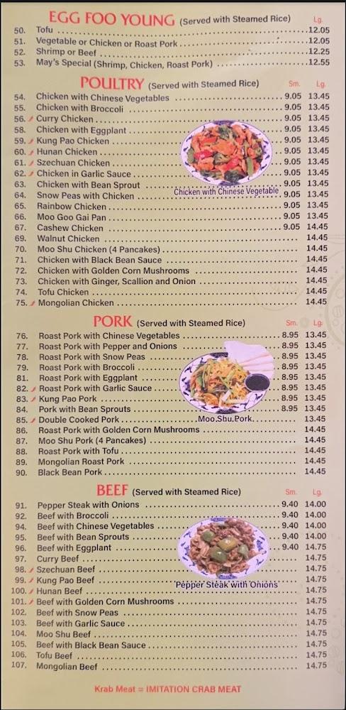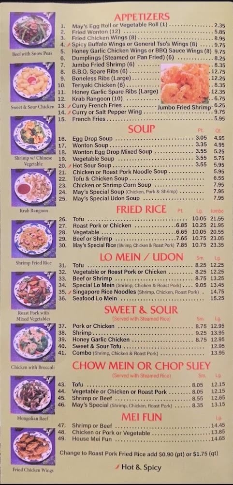 The friendly crew remembers regular diners by name and order, creating a sense of loyalty and connection beyond just a meal. Our menu’s variety—from flavorful soups like wonton to savory appetizers including crab rangoon—has something for everyone, whether you seek a quick bite or a wholesome dinner. We maintain a casual and quiet ambiance so you can enjoy your food comfortably. May's Kitchen has become a trusted staple where customers come repeatedly, sometimes traveling miles just to savor our food. Here, excellence in taste and efficient service meet under one roof to provide a dining experience that feels like home.